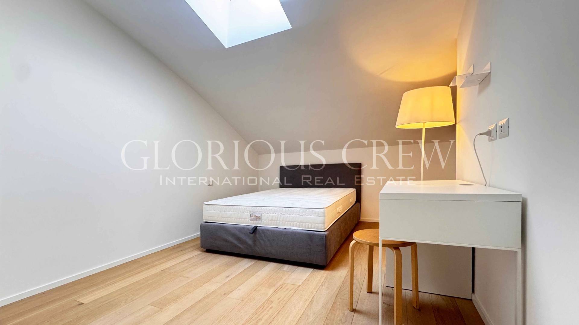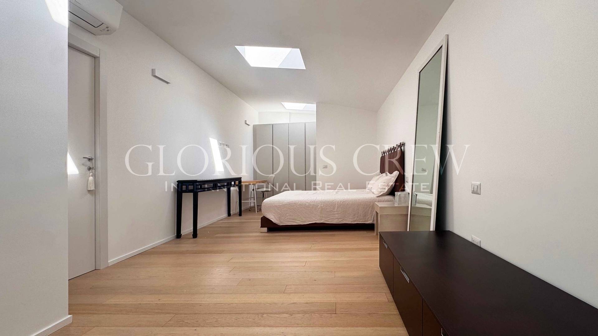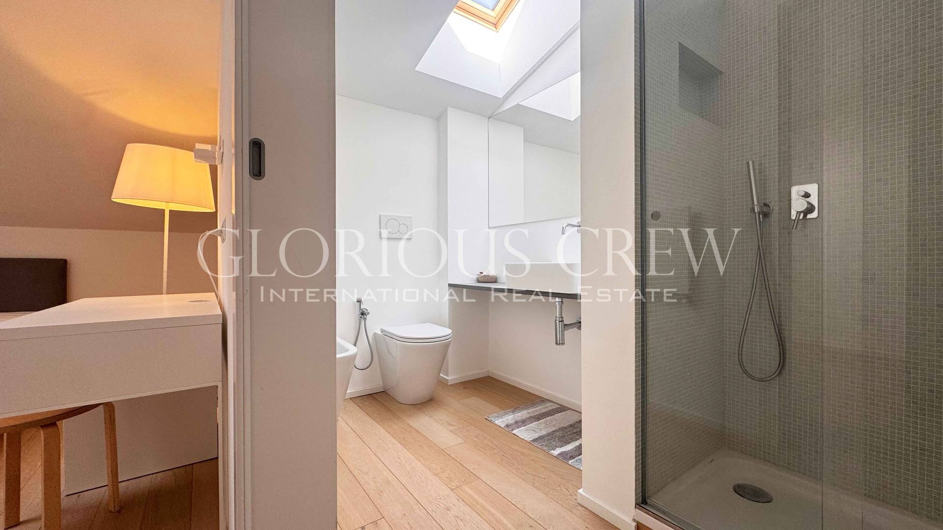 On the upper attic floor, the sleeping area includes two bedrooms and two bathrooms. The bedrooms are very spacious, both with walk-in closets and the master bedroom with en-suite bathroom, characterized by generous heights and abundant natural light.