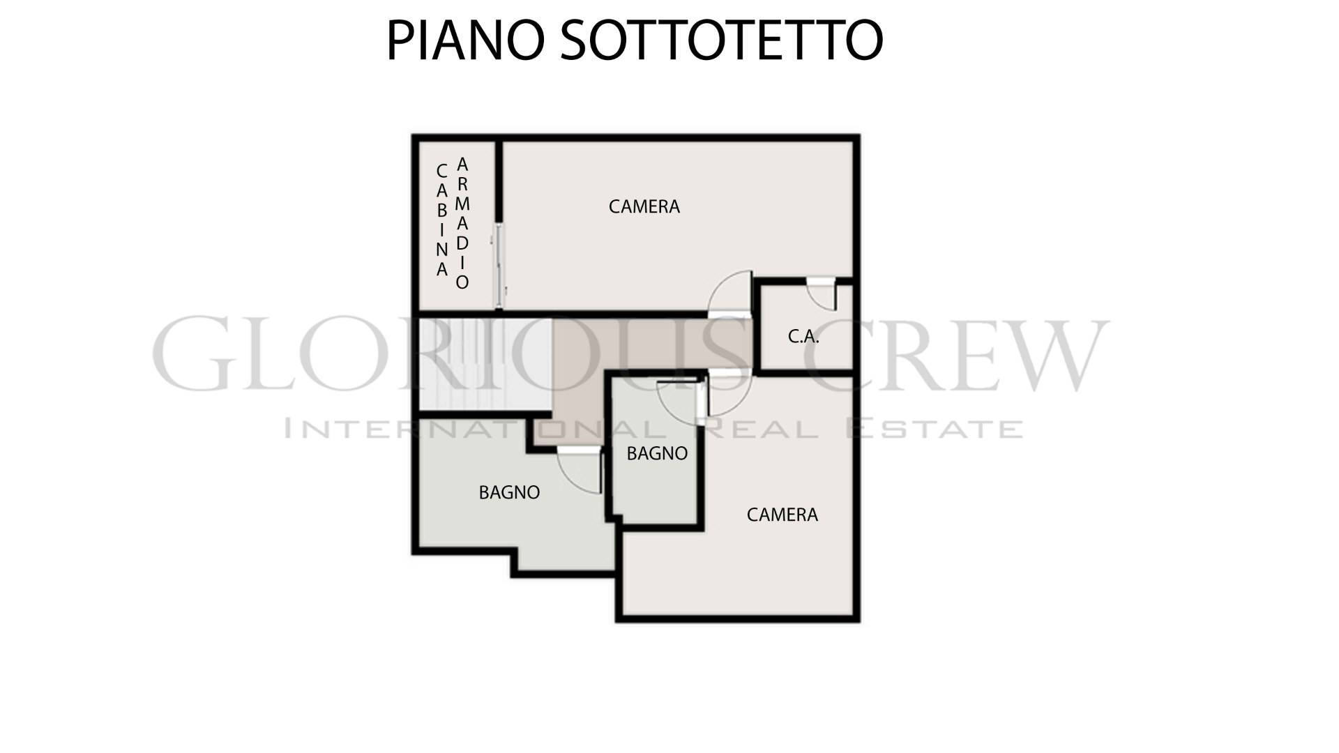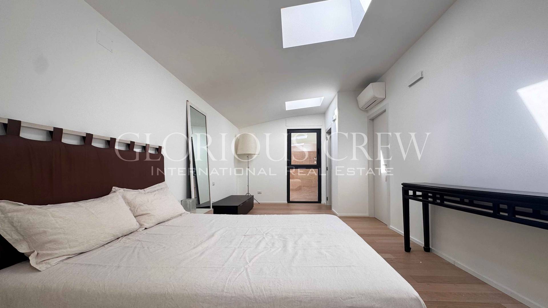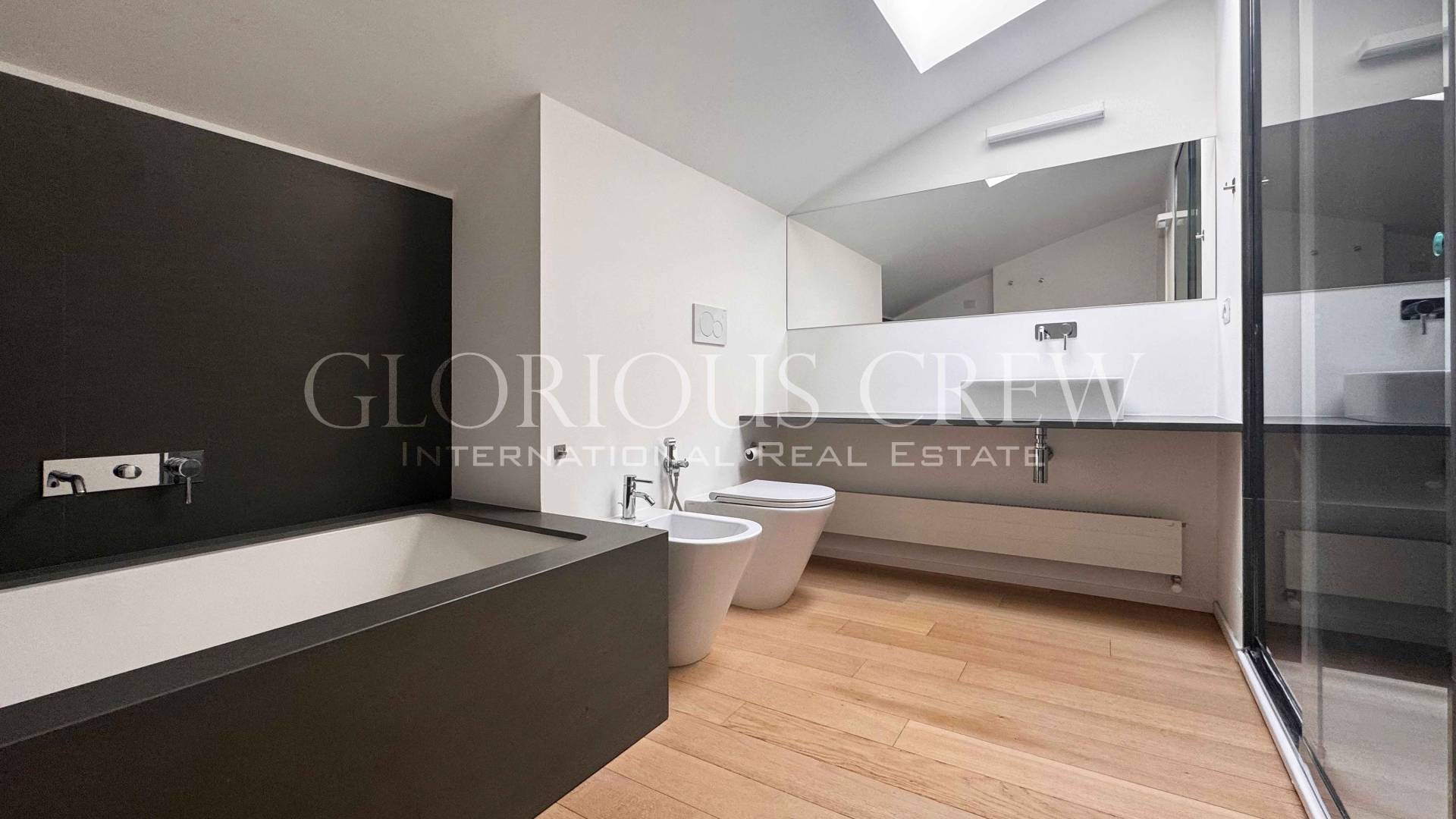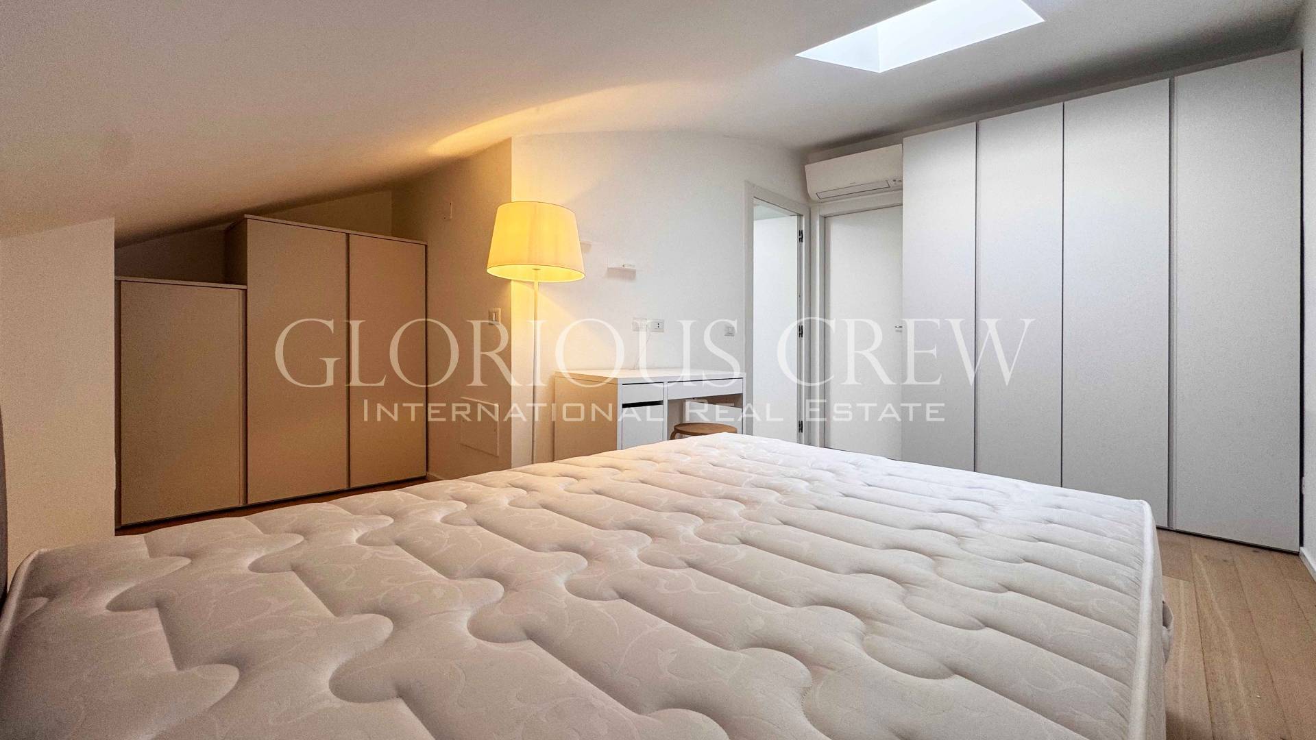 On the upper attic floor, the sleeping area includes two bedrooms and two bathrooms. The bedrooms are very spacious, both with walk-in closets and the master bedroom with en-suite bathroom, characterized by generous heights and abundant natural light.