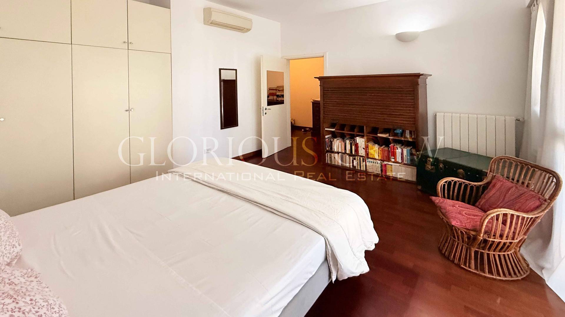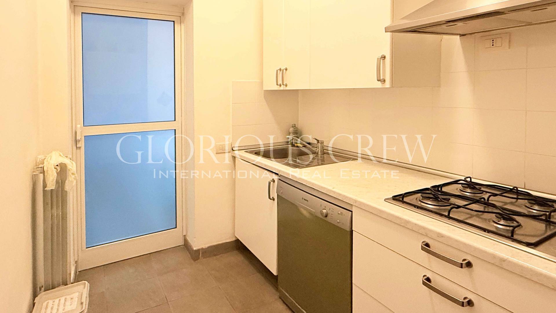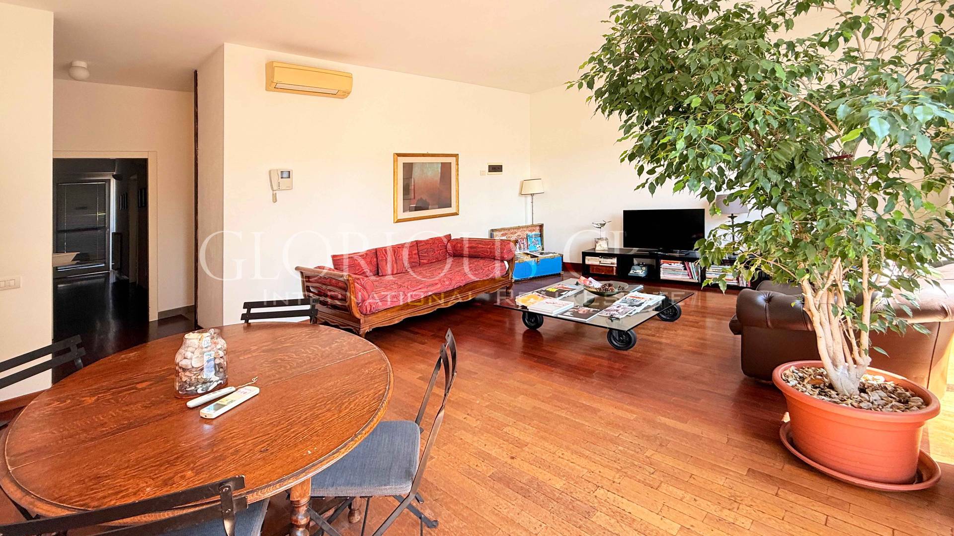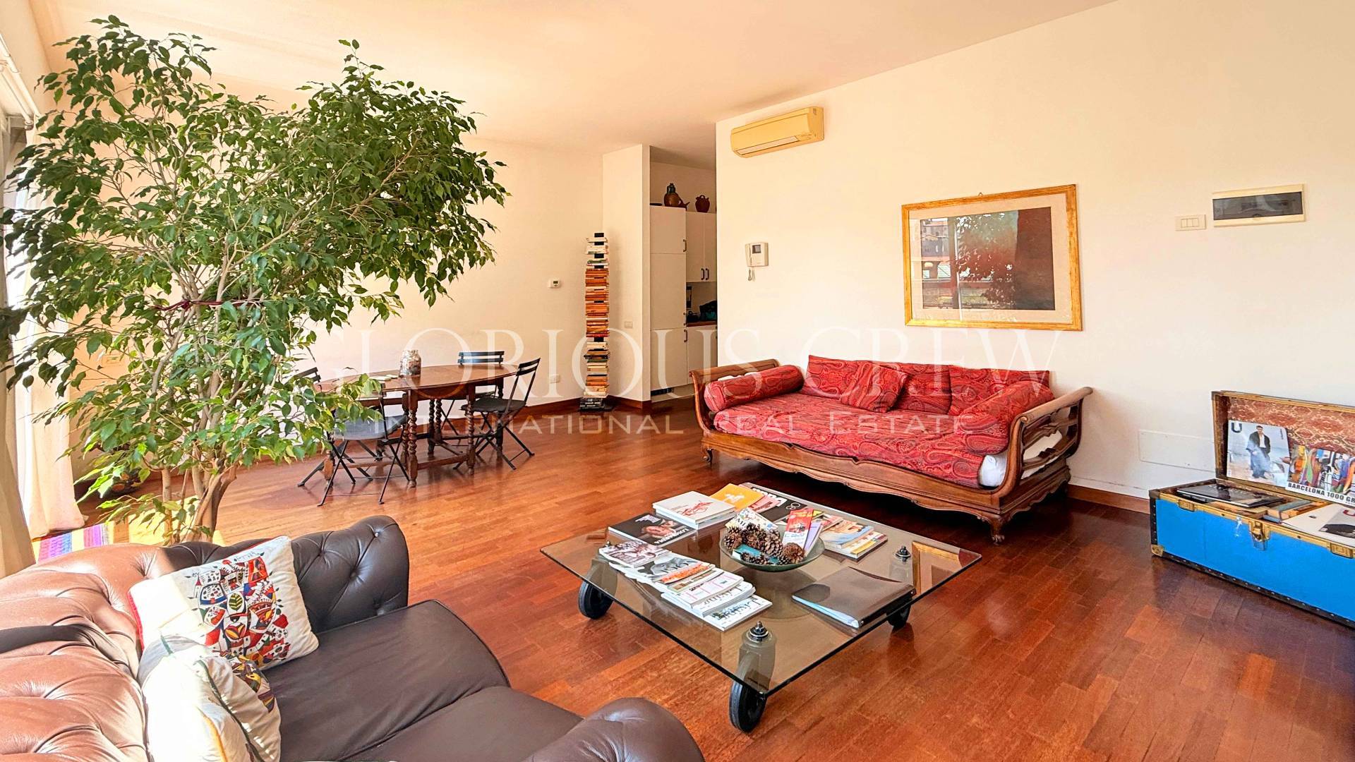 The total floor area is approximately 90 square meters, currently divided into a double bedroom and a living area consisting of a bright double living room (which could be converted into a second bedroom) and a magnificent terrace with trees open on two sides, offering pleasant views and ventilation, ideal for summer days. The kitchen leads to a comfortable internal balcony equipped as a laundry room. The bathroom has a window. The rooms, finely furnished and meticulously designed, offer an elegant and comfortable atmosphere.