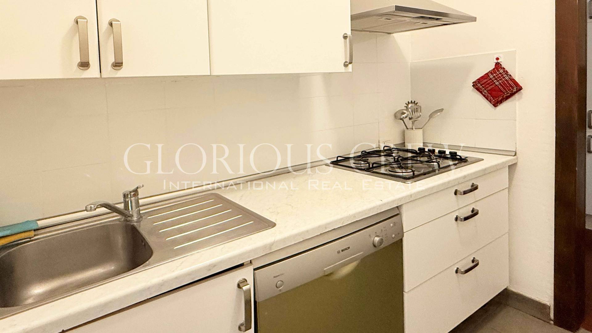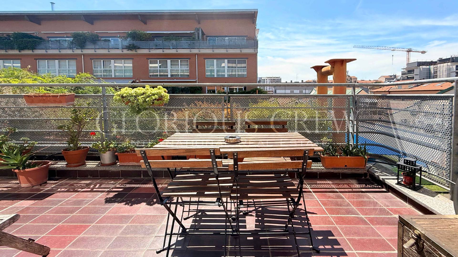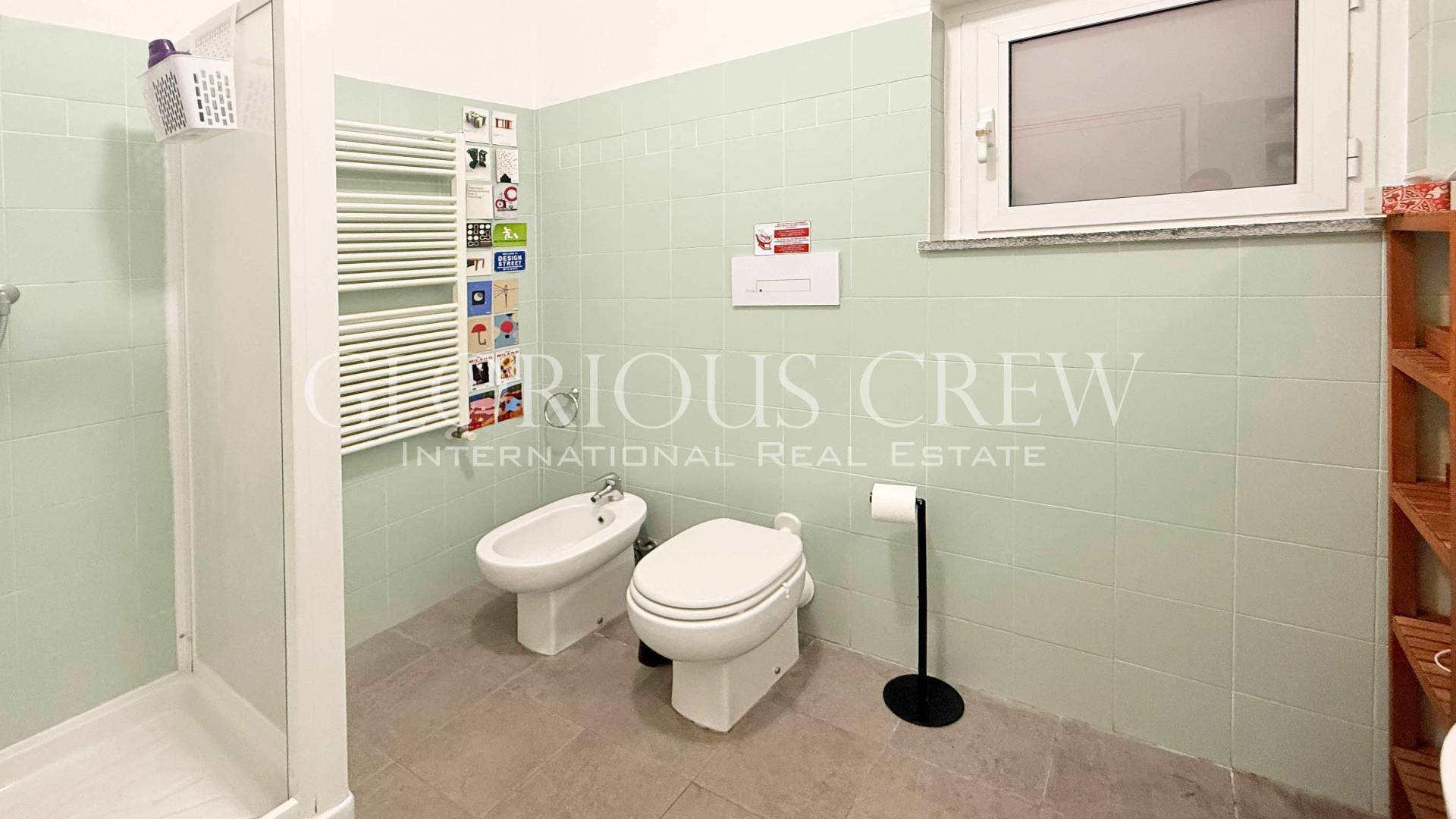 The total floor area is approximately 90 square meters, currently divided into a double bedroom and a living area consisting of a bright double living room (which could be converted into a second bedroom) and a magnificent terrace with trees open on two sides, offering pleasant views and ventilation, ideal for summer days. The kitchen leads to a comfortable internal balcony equipped as a laundry room. The bathroom has a window. The rooms, finely furnished and meticulously designed, offer an elegant and comfortable atmosphere.