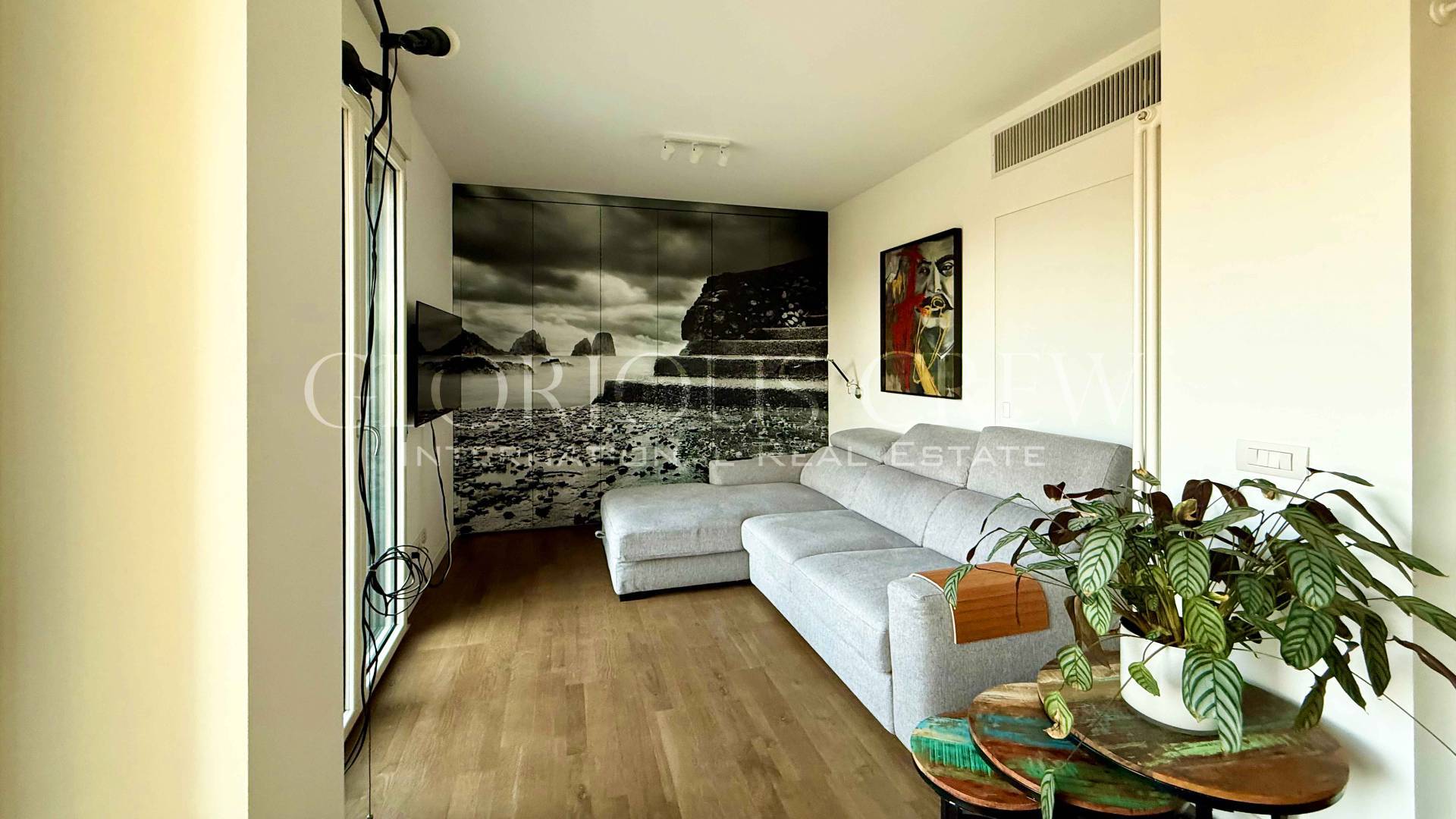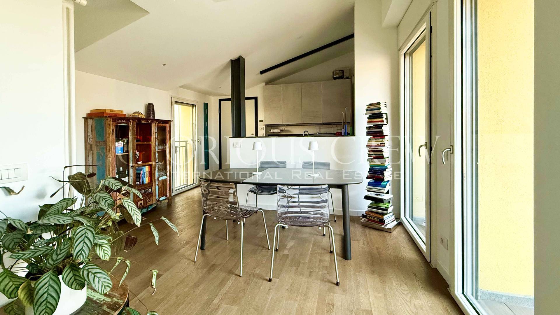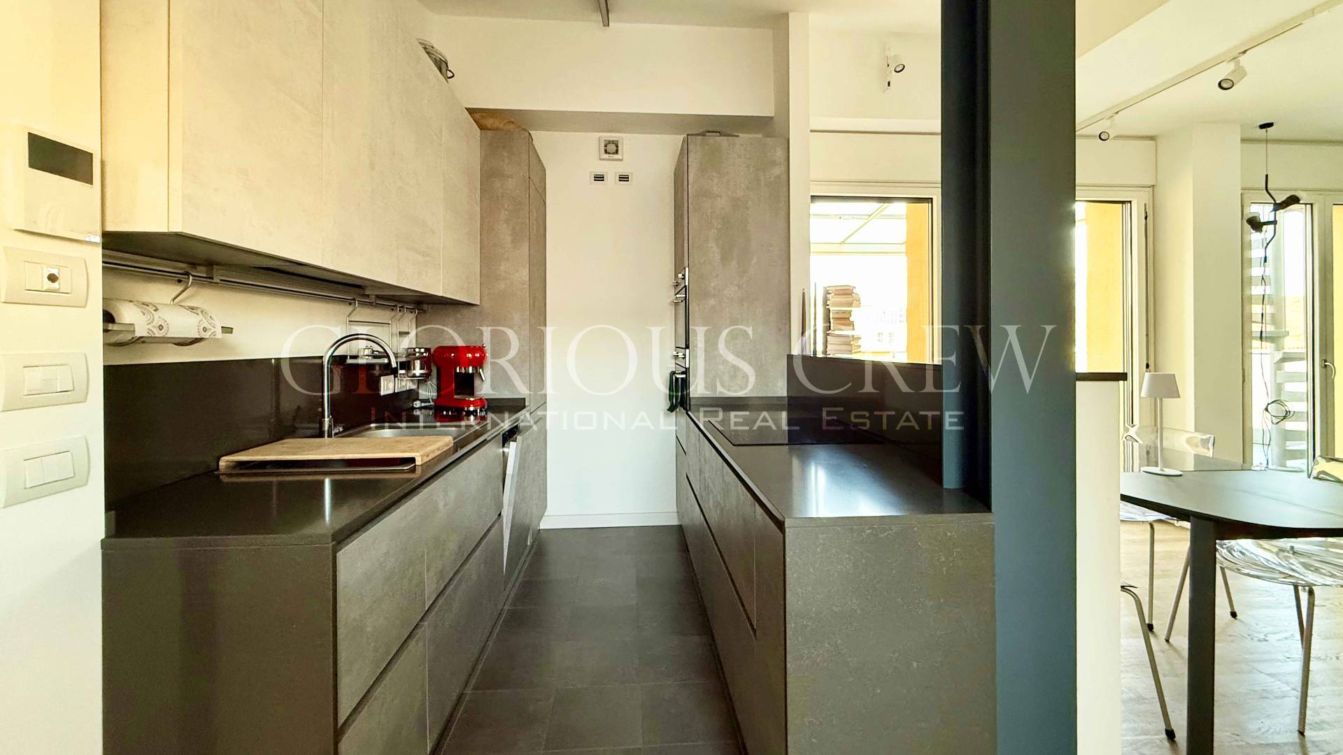 L’ingresso apre su una luminosa zona living con cucina a vista, perfettamente organizzata e dotata di elettrodomestici di alta gamma. La zona pranzo e il soggiorno affacciano direttamente sul terrazzo, arricchito da una veranda bioclimatica che ne consente l’utilizzo anche nella stagione invernale.