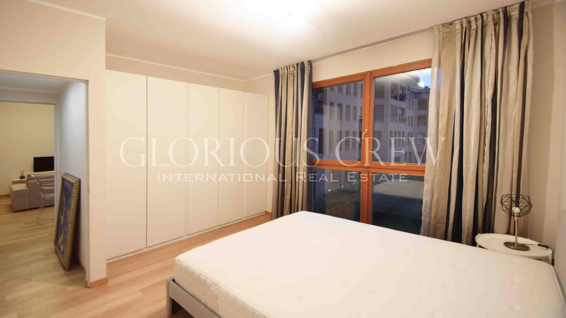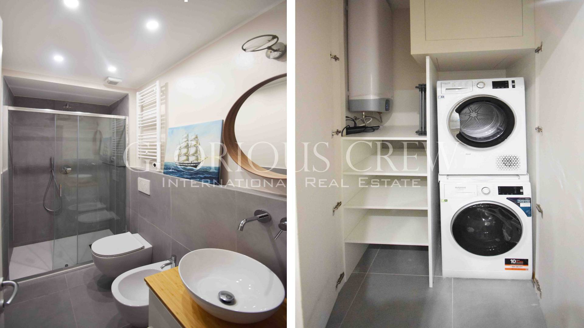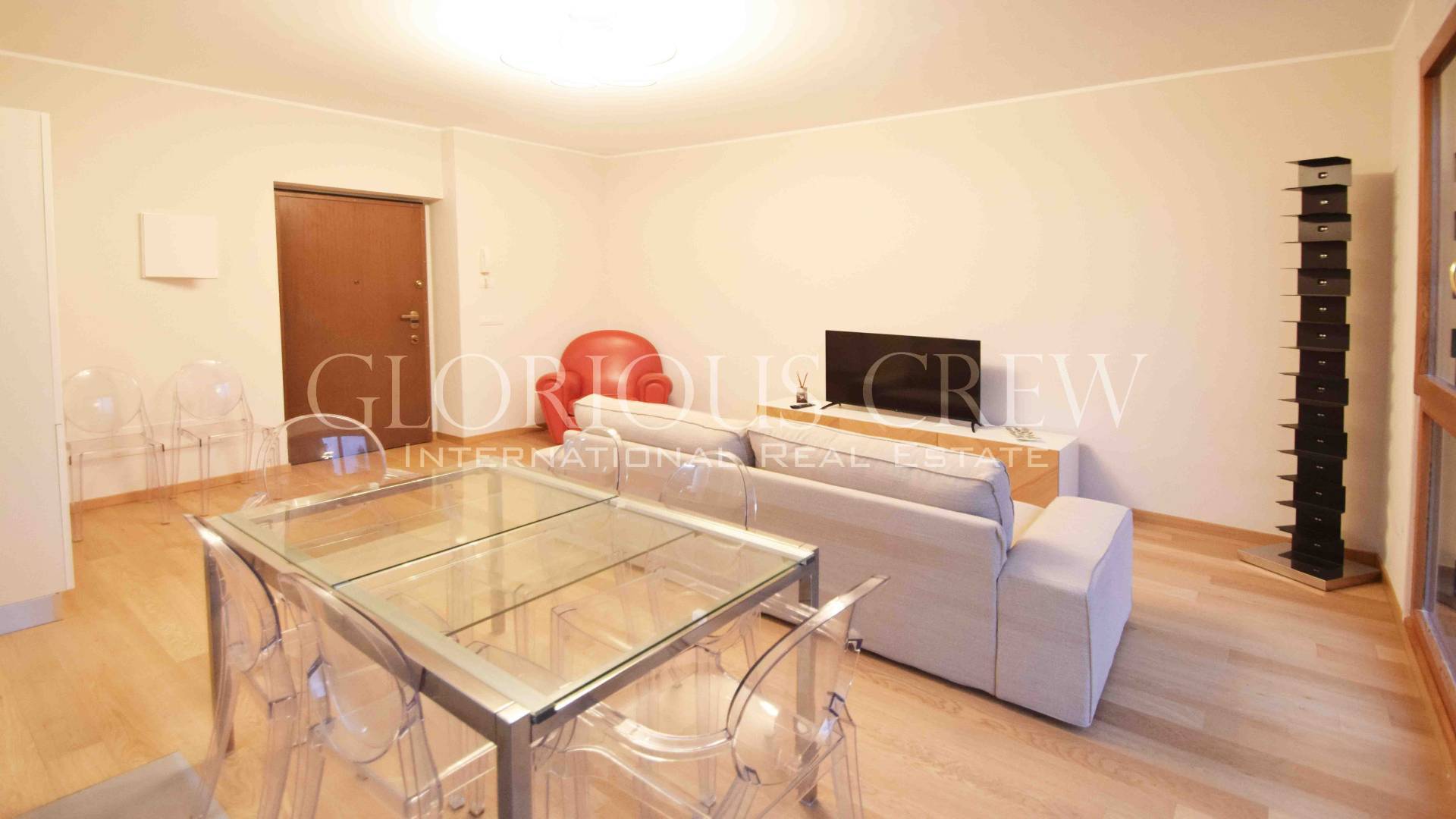 Varcando la soglia della porta blindata si accede alla residenza caratterizzata da finiture di pregio come il pavimento in parquet in rovere, ampie vetrate, arredamento di design (poltrone e pouf Chester di Poltrona Frau, libreria Original Ptolomeo di Opinion Ciatti, lampade Fontana Arte) ed armadiature su misura. La cucina, di Cappellini Cucine, è completa di accessori ed elettrodomestici. Il bagno è spazioso, con sanitari sospesi e comoda doccia. L'aria condizionata, il riscaldamento e l'acqua calda sono autonomi.