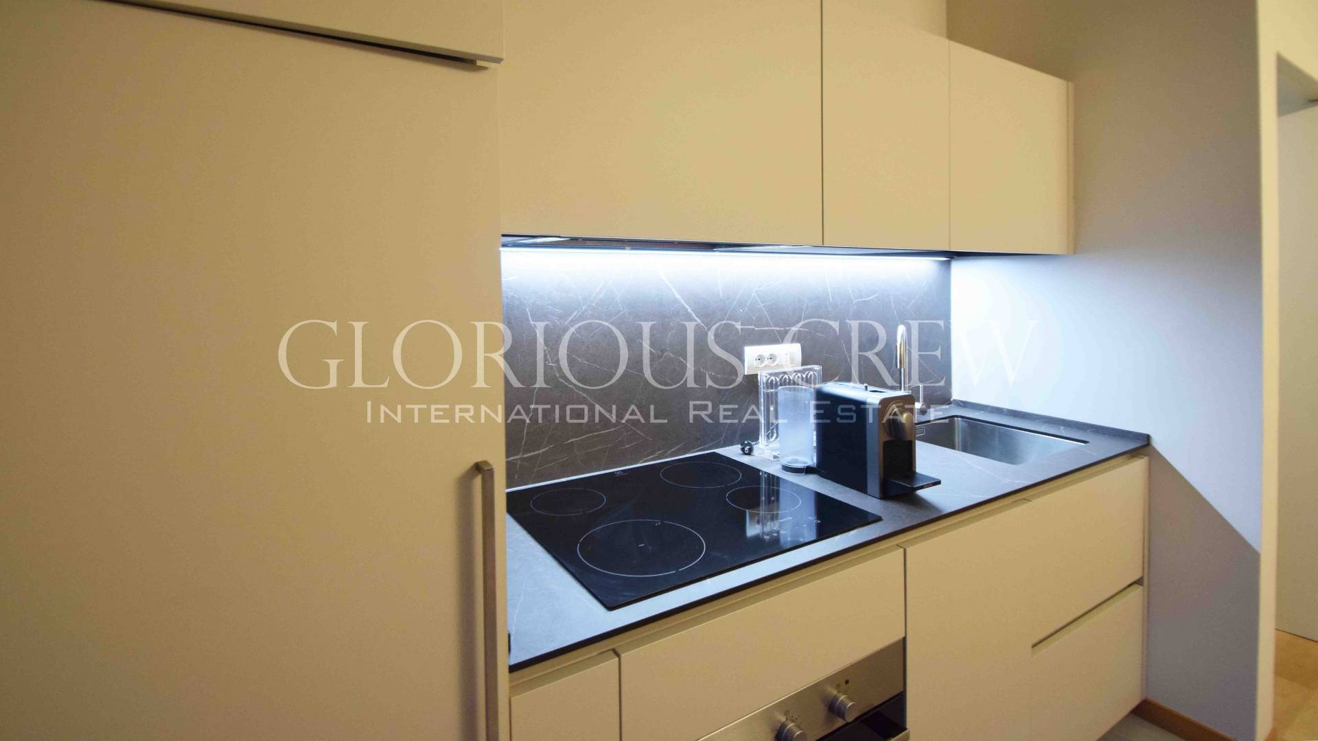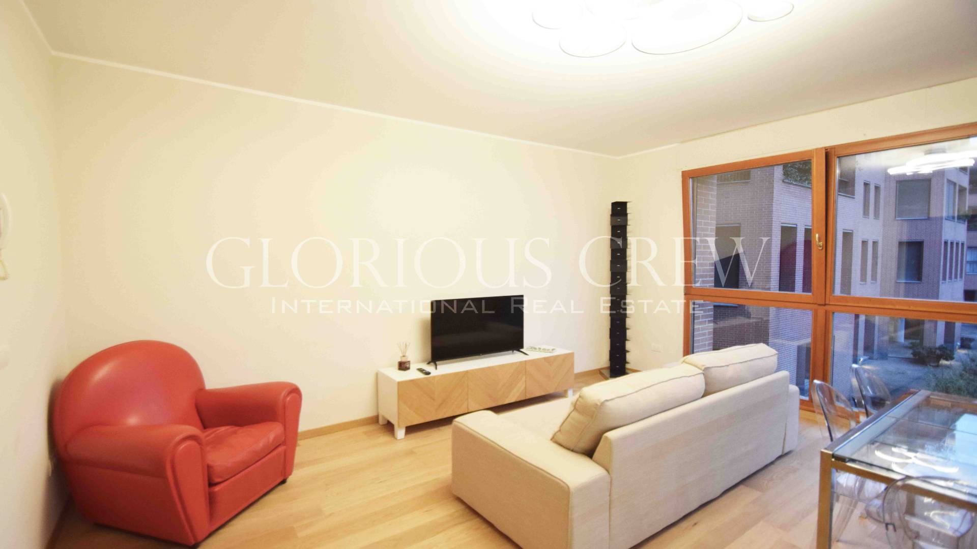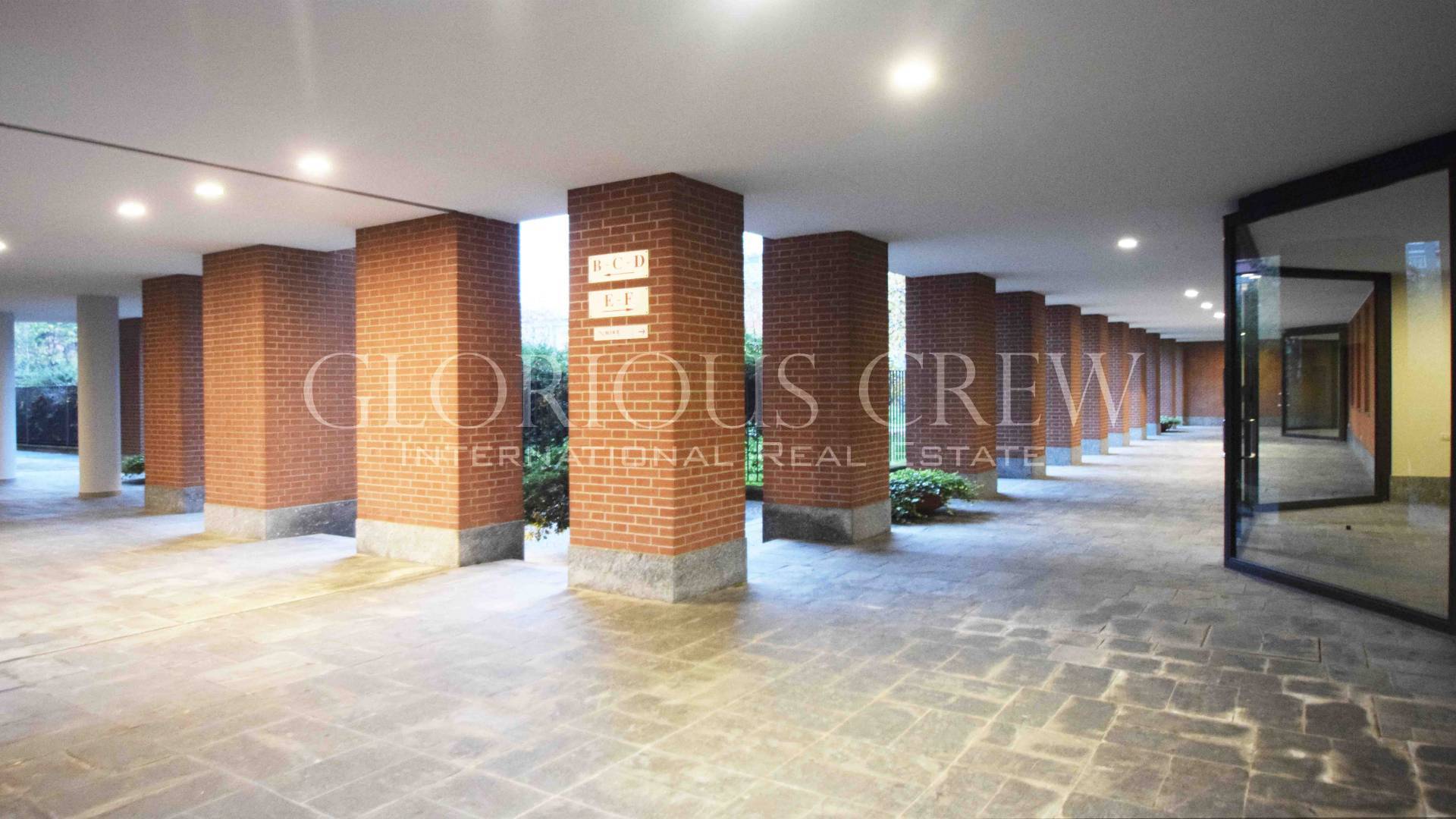 Varcando la soglia della porta blindata si accede alla residenza caratterizzata da finiture di pregio come il pavimento in parquet in rovere, ampie vetrate, arredamento di design (poltrone e pouf Chester di Poltrona Frau, libreria Original Ptolomeo di Opinion Ciatti, lampade Fontana Arte) ed armadiature su misura. La cucina, di Cappellini Cucine, è completa di accessori ed elettrodomestici. Il bagno è spazioso, con sanitari sospesi e comoda doccia. L'aria condizionata, il riscaldamento e l'acqua calda sono autonomi.