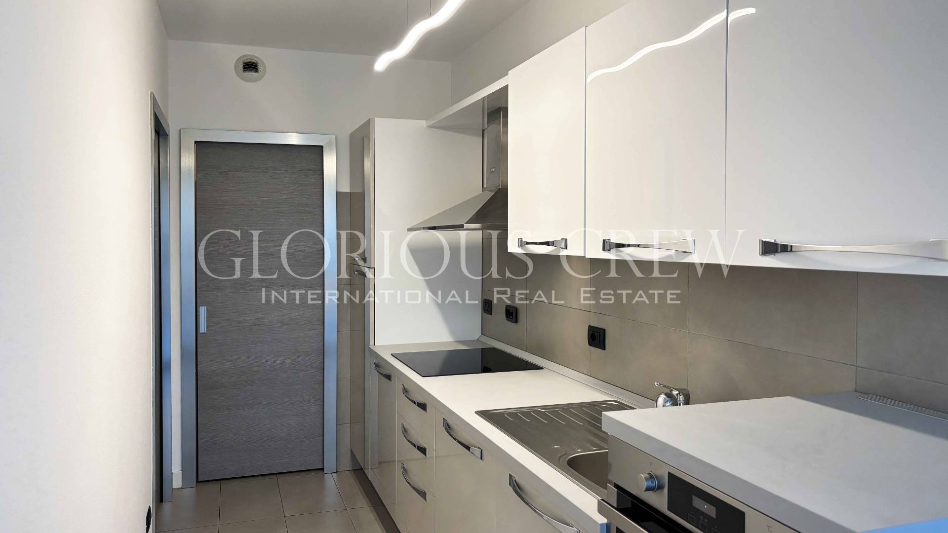 La cucina, caratterizzata da un elegante rivestimento bianco e da linee moderne, è situata in un ambiente separato dalla zona giorno. È completamente attrezzata con elettrodomestici di ultima generazione e adiacente ad un utile ripostiglio dotato di un mobile con ripiani e lavatrice.