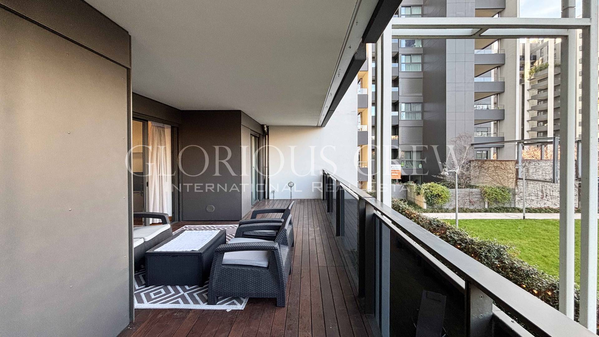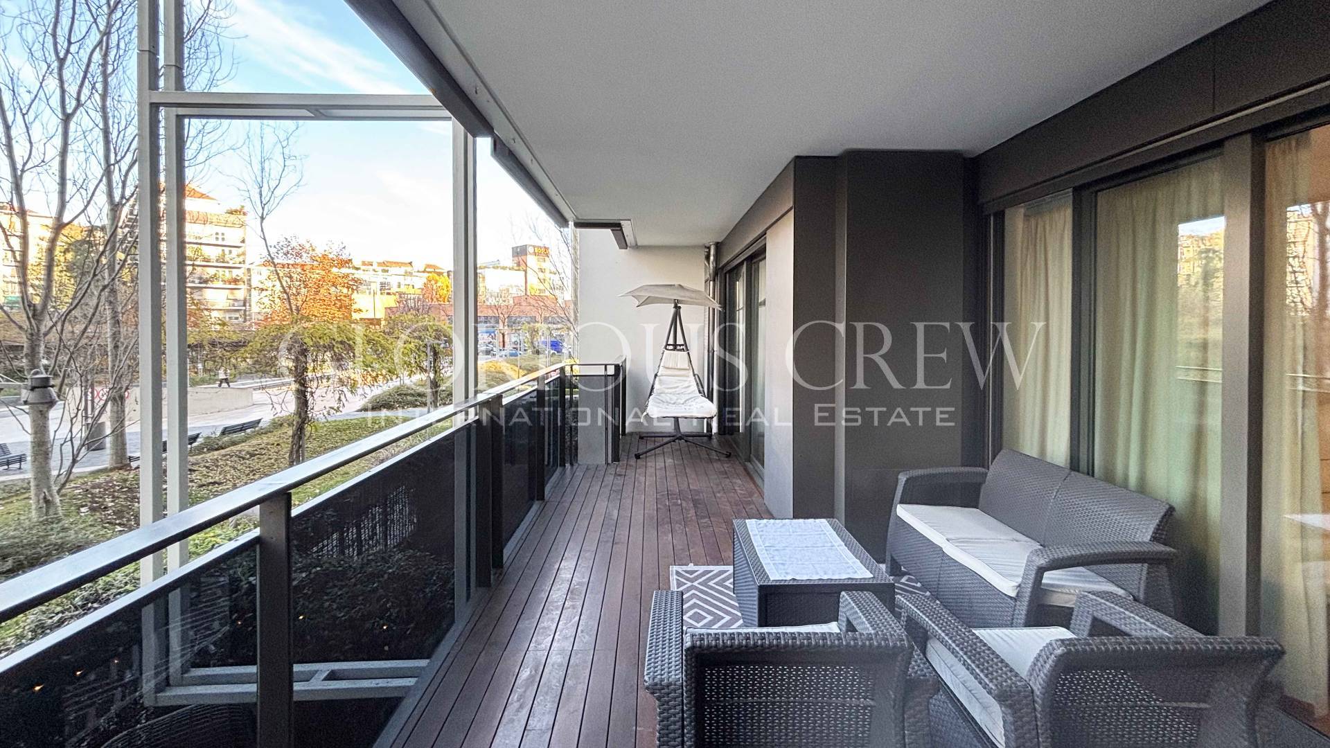 Tutti gli ambienti godono di accesso diretto all' ampio terrazzo, dotato di mobili da esterno, ideale per trascorrere piacevoli momenti di relax all'aperto.