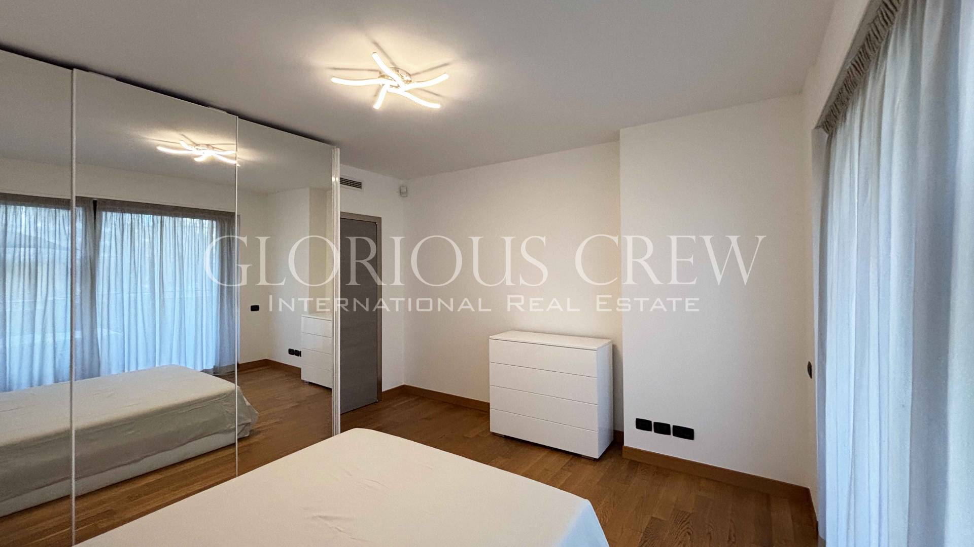 La camera matrimoniale è arredata con un letto imbottito, dalle tonalità chiare e con contenitore, un armadio a specchio con ante scorrevoli e una cassettiera coordinata.