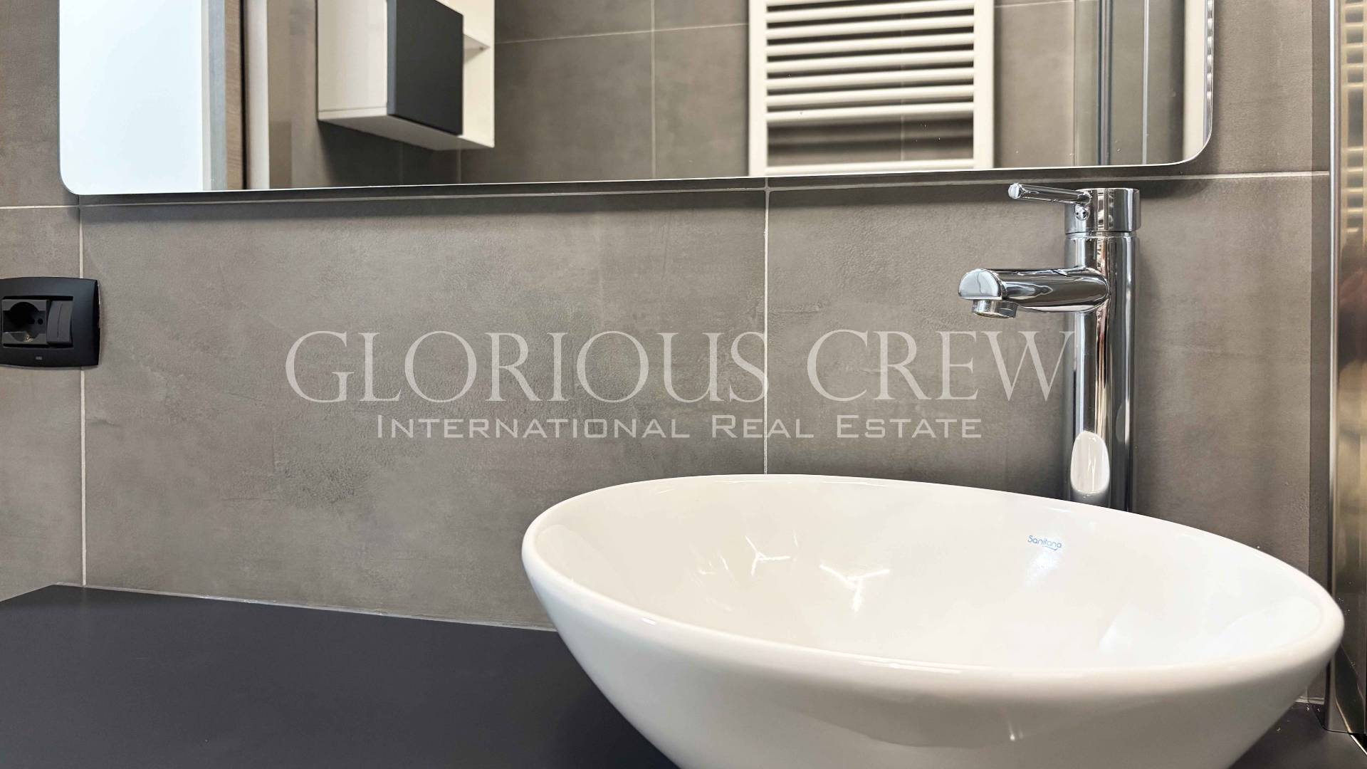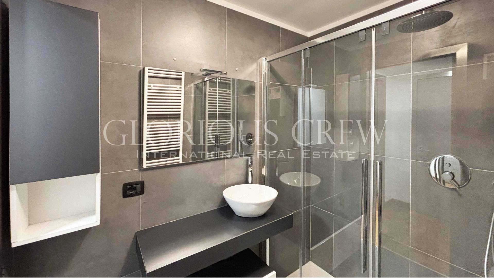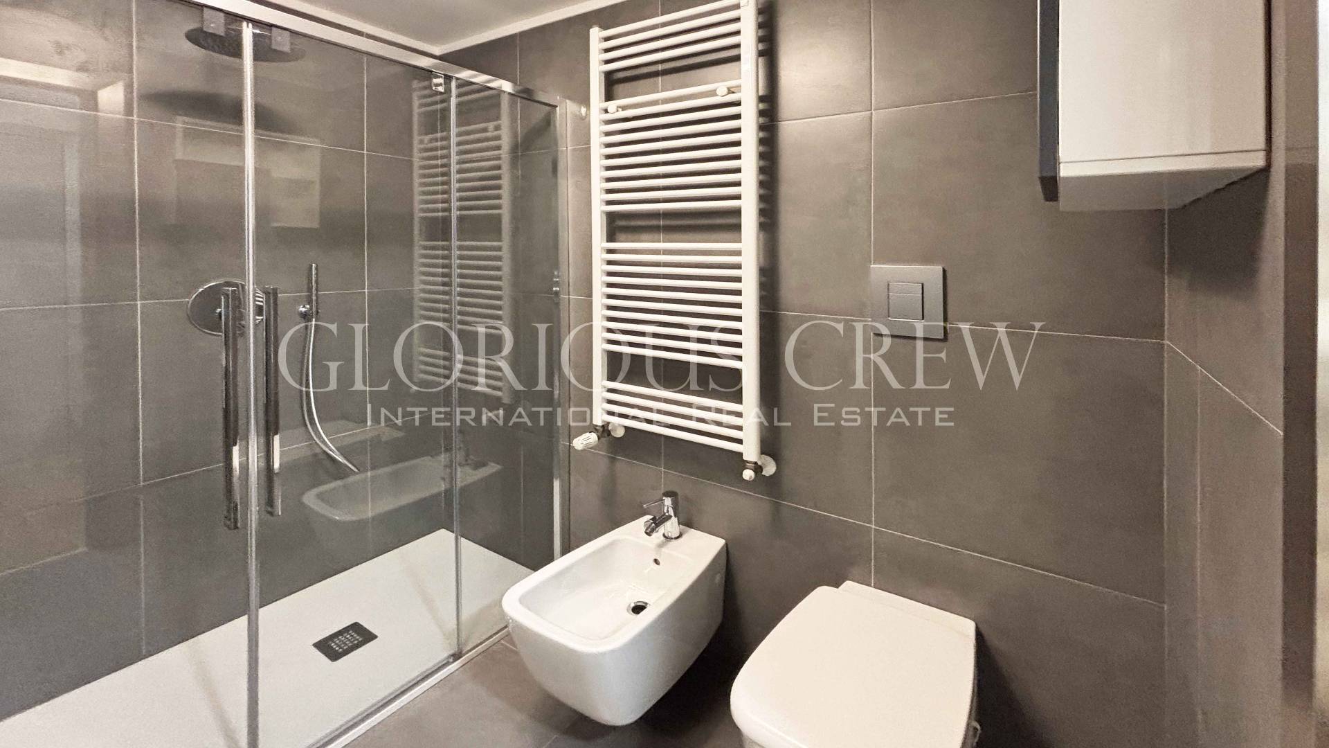 Attraversando un disimpegno, attrezzato con un capiente mobile a ante, si accede al bagno, che presenta una doccia spaziosa, sanitari sospesi e pratici mobili contenitori.